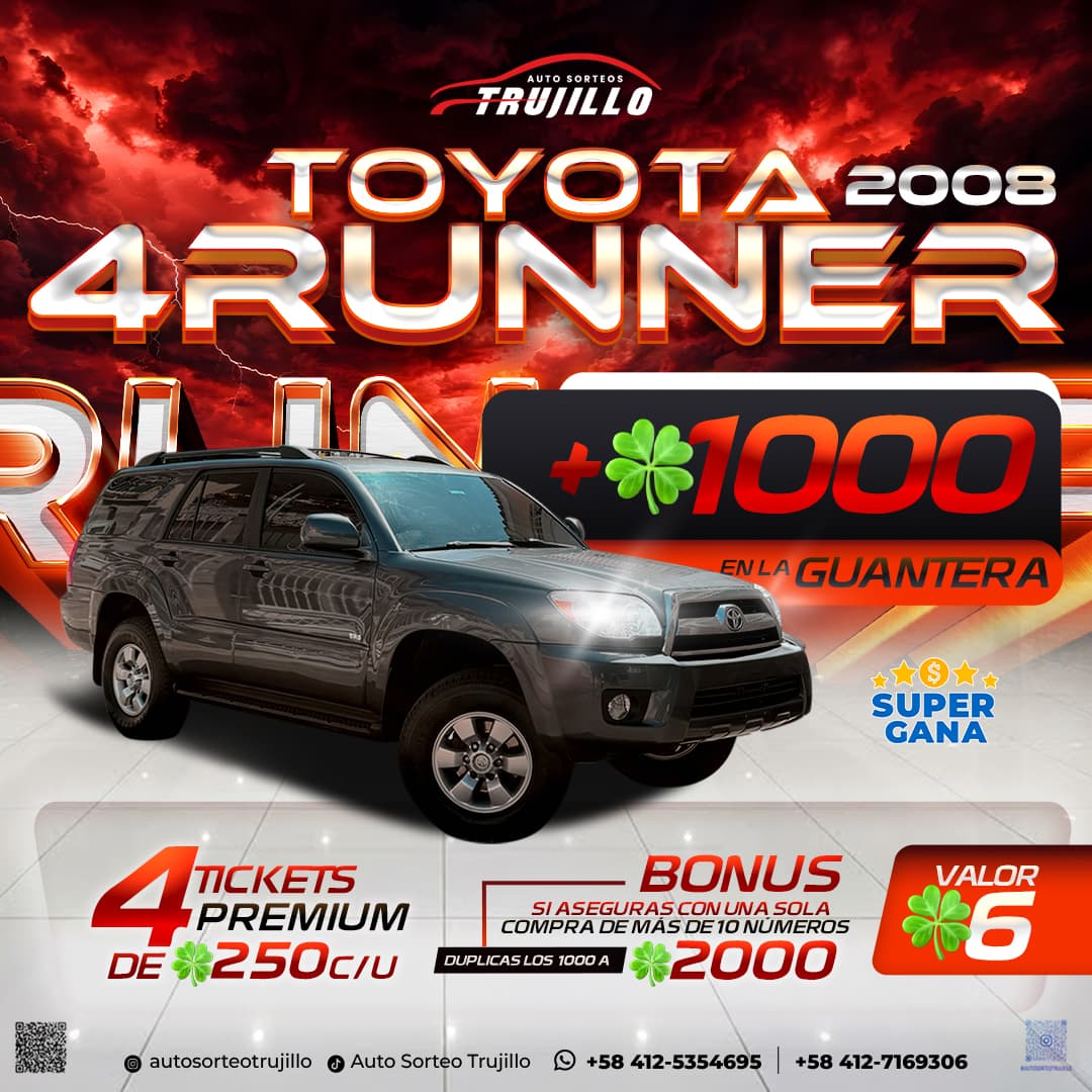 ¡Tu próxima gran historia comienza por solo 6 BENDICIONES! 🍀🚙 No es solo una camioneta, es el paquete completo con Auto Sorteo Trujillo. Participa por una robusta Toyota 4Runner año 2008 equipada para la diversión. ¿Qué te llevas con tu ticket de 6? 1️⃣ El vehículo Toyota 4Runner. 2️⃣ + 1,000 BENDICIONES 🍀 (con transferencia inmediata en la guantera). 🚀 ¡BONUS DE DOBLE PREMIO! Si aseguras más de 10 números en una sola compra, las bendiciones de la guantera se DUPLICAN automáticamente a 2,000 BENDICIONES. 💸 🎁 Y hay más: Participas por 4 Premios Extra de 250 BENDICIONES c/u con transferencia inmediata. ¡No dejes que se la lleve otro! Aprovecha el bonus y compra tus tickets hoy con Auto Sorteo Trujillo. 🎫✨